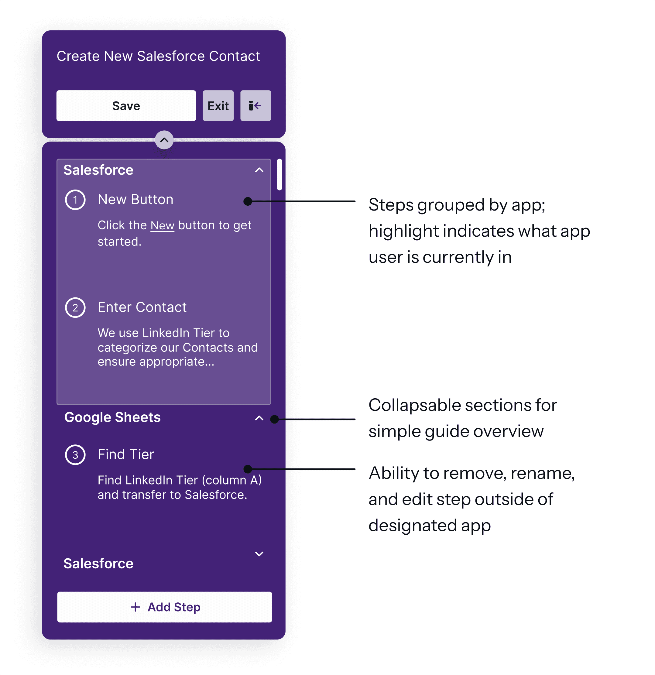 Using feedback gained from research on Engage’s VDS, Adopt Studio was aimed at reducing cognitive load while building a guide. I followed the concept of the wysiwyg editor; what you see is what you get.